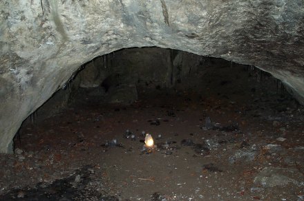 Der Eingangbereich mit winterlichen Eisbildungen, links hinten befindet sich das eigentliche Einstiegsloch zur Höhle